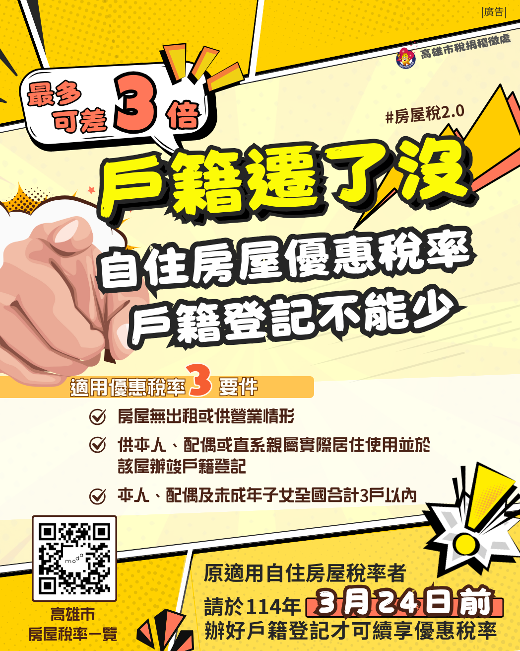 更多房屋稅新制詳情請至高雄市稅捐稽徵處官網「房屋稅差別稅率專區」(https://gov.tw/FqX)查詢